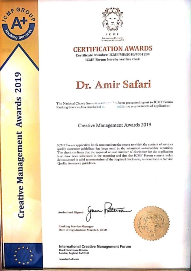 امیر صفری دارای دو قانون ۸safari” و ( ۸credit) در مدیریت بنام خویش میباشد .و تمبر رسمی اختصاصی شرکت ملی پست ایران در چند نوبت در مقام تجلیل از ایشان چاپ شد.